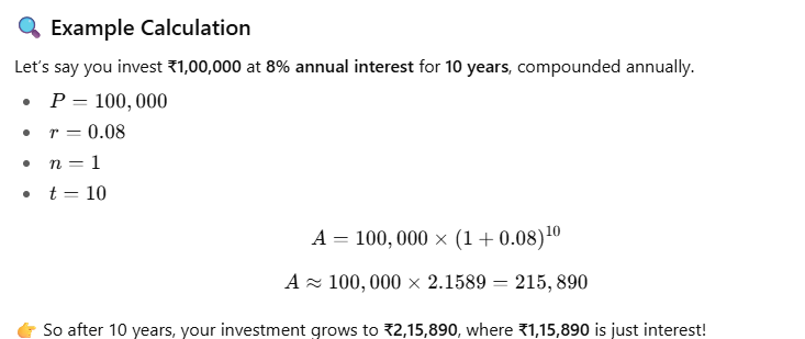 - Invest Regularly – Add monthly or yearly contributions to boost compounding.